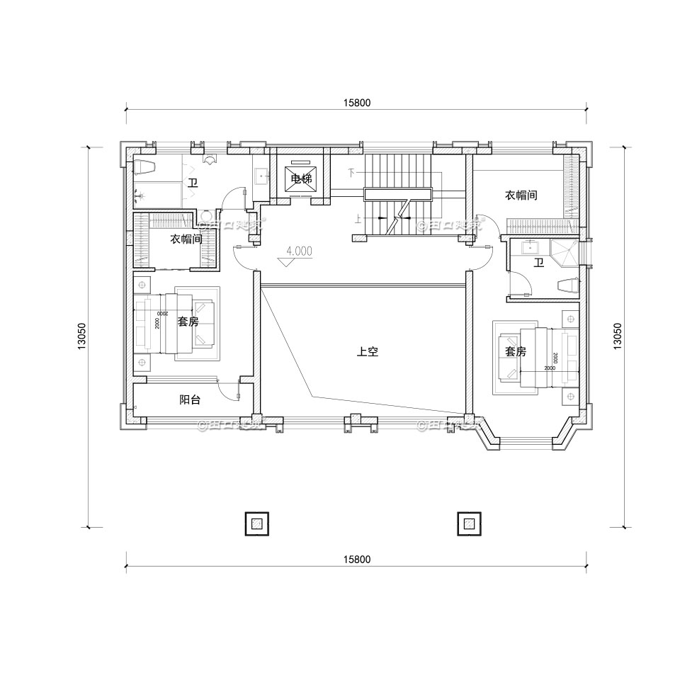 一层:门厅、客厅、挑空堂前品茗区、厨房、餐厅、老人房、公卫、电梯;