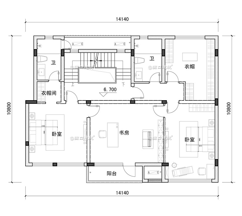 三层:两套房(带卫、衣帽)、共享书房、共享阳台;