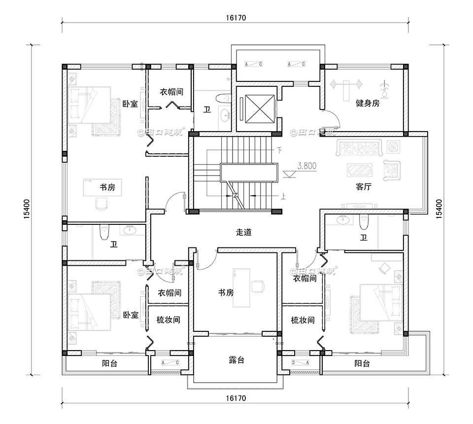 三大套房(带卫生间、衣帽间、其中一个还带书房,两个带阳台),客厅、健身、书房、储藏室、露台;