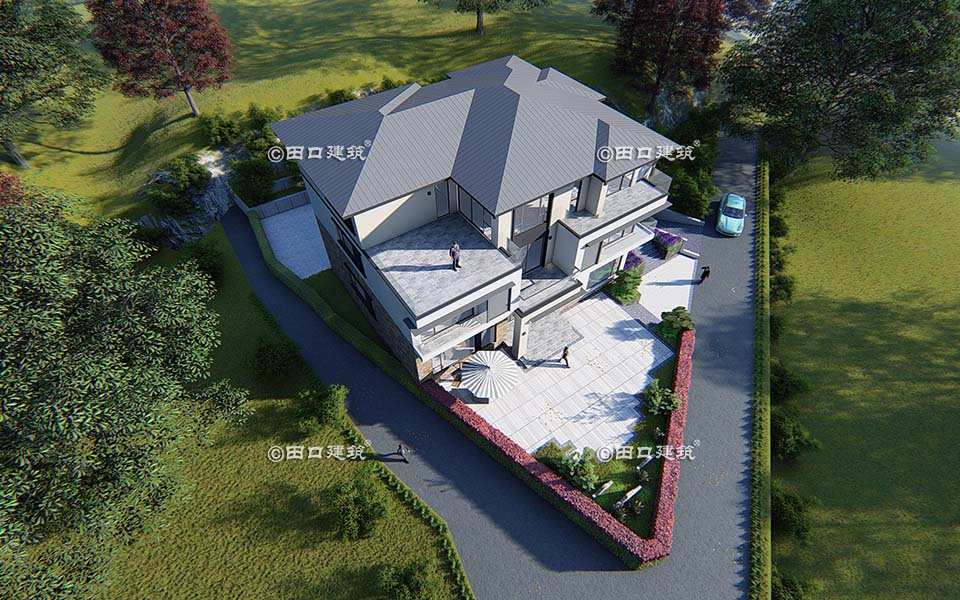此地基背山,正面朝向田野,且高出田野足足2米有余,从远处看非常显眼。业主希望设计一栋在整个村子里最独特的房子,在看过现场与业主沟通之后,我们建议业主做现代风格,在村里绝对独一无二的存在。