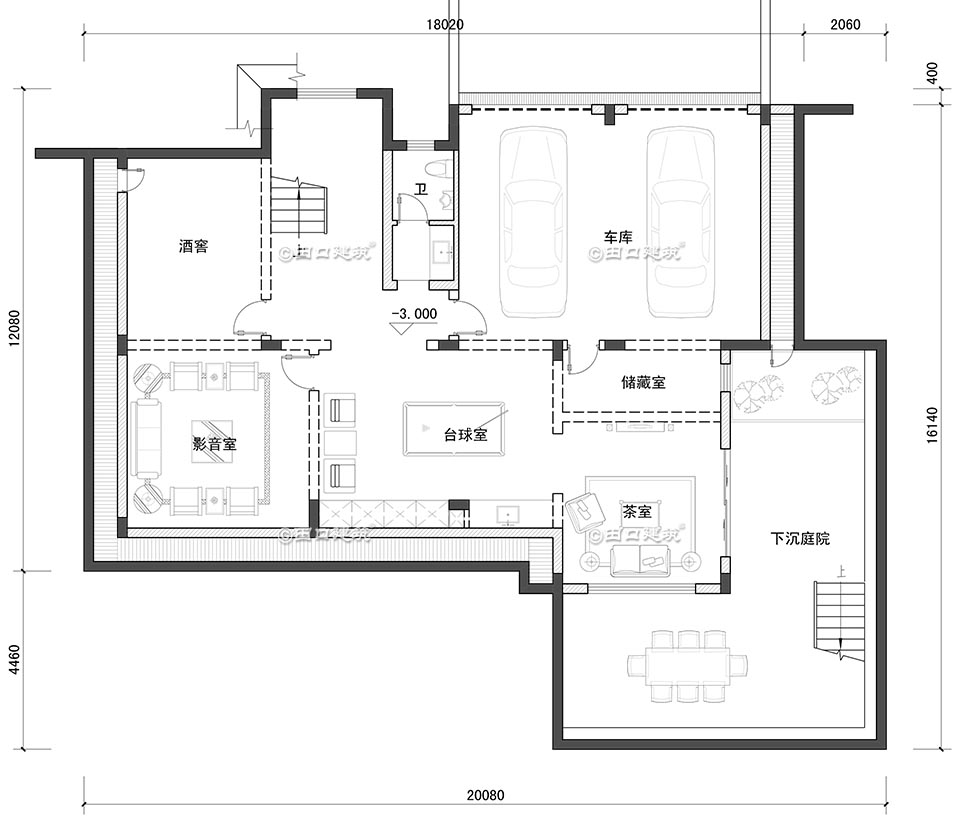 地下室:车库、台球室、茶室、影音室、酒窖、储藏室、公卫、下沉庭院;