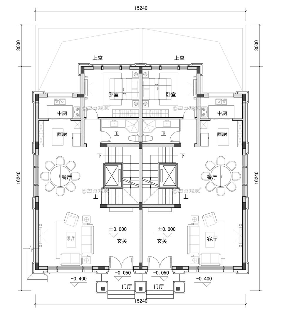 一层(每户):门厅、玄关、客厅、餐厅、中西厨、卧室、卫;