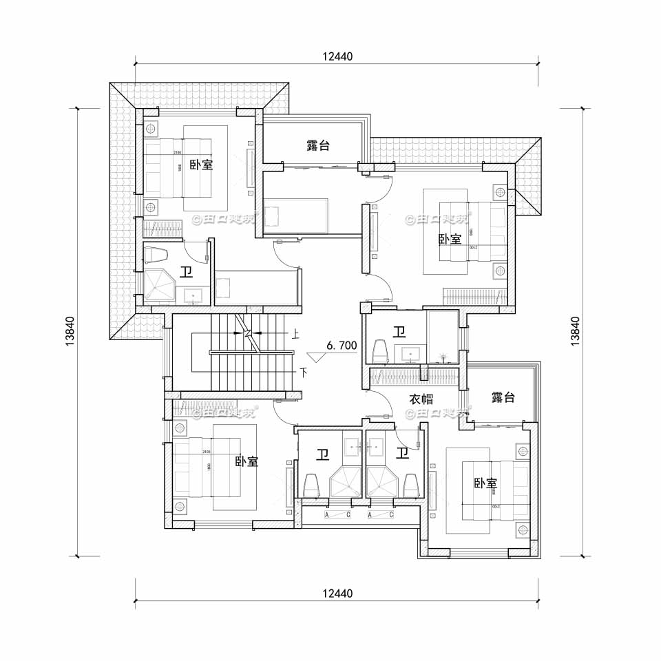 二层:四个套间、起居室、阳台;