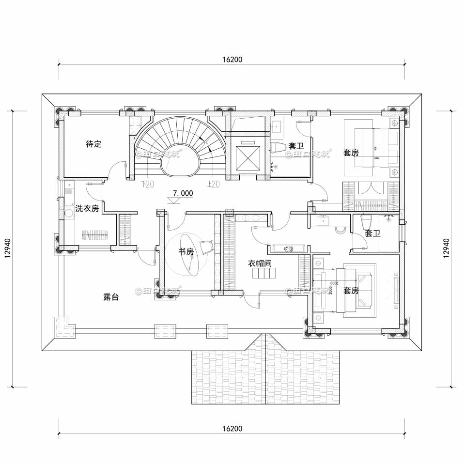 三层:东面大小两个套房、书房、洗衣房、露台;
