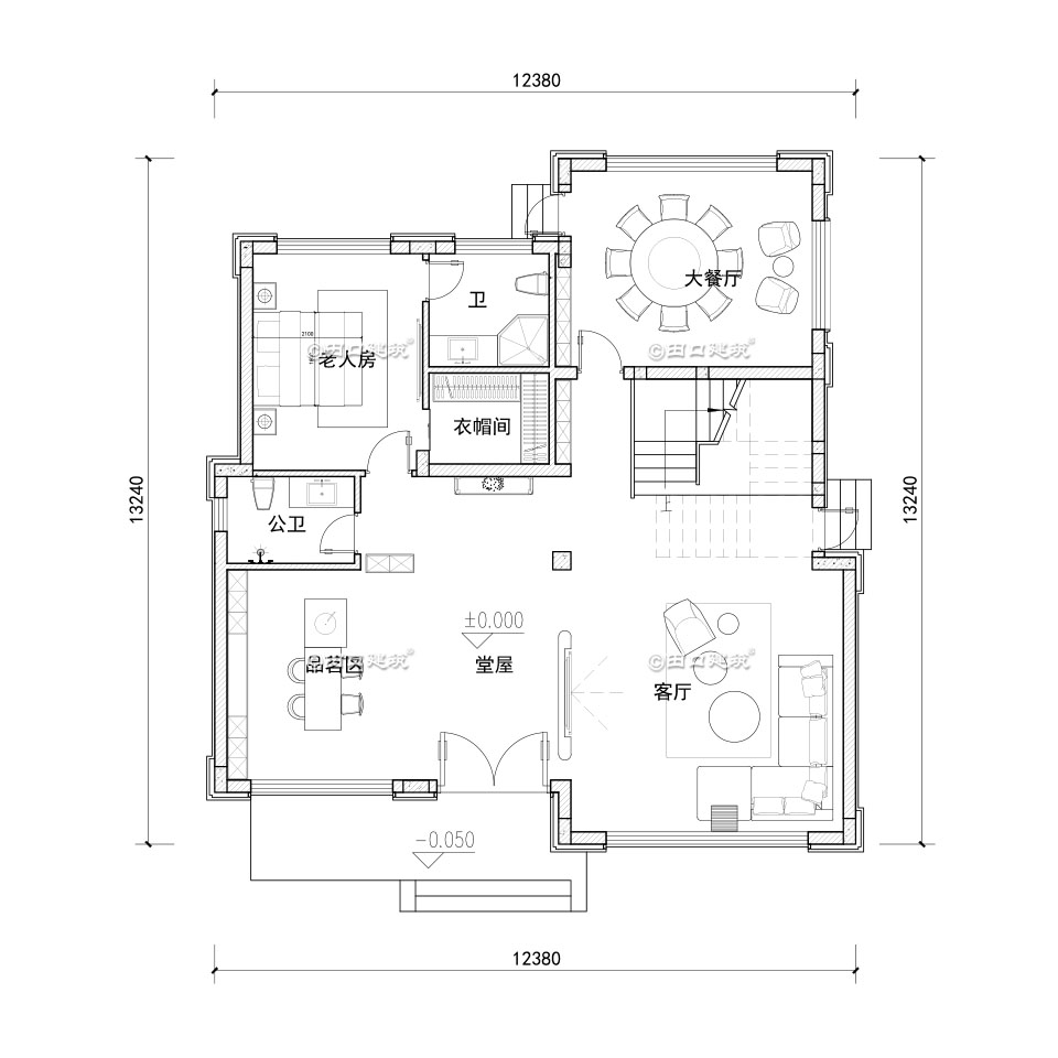 一层:门厅、堂屋、挑空客厅、品茗区、大餐厅(厨房位于附房)、公卫、套房;