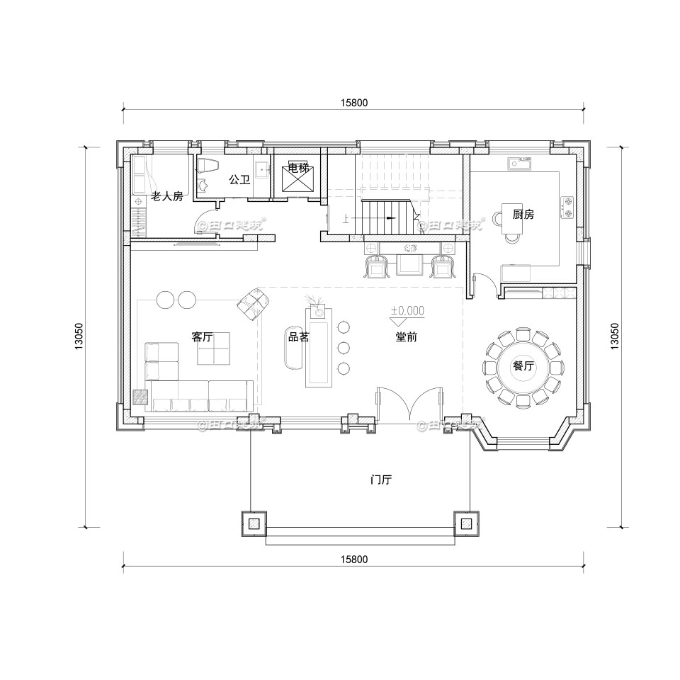 一层:门厅、客厅、挑空堂前品茗区、厨房、餐厅、老人房、公卫、电梯;