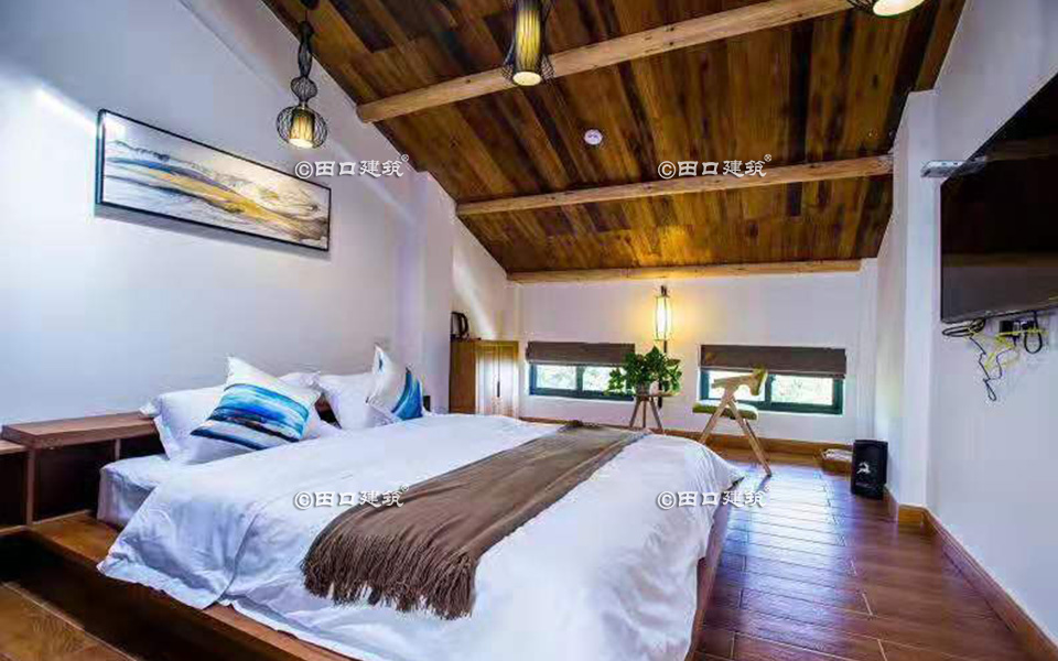 民宿前厅、大堂、服务台、三个单人套间;