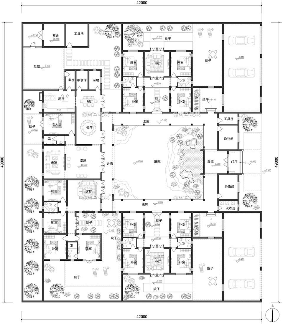 院子朝东,中间主楼卫共用,堂屋、茶室、老人房、厨房、餐厅、卫、柴房、储藏室、杂物间以及工具间、禽舍。东南院和东北院为南北对称关系,四房两卫一厅。西南院四房两卫一厅。除此之外,入口处设计了杂物间、工具房、洗衣房,以及停车位;