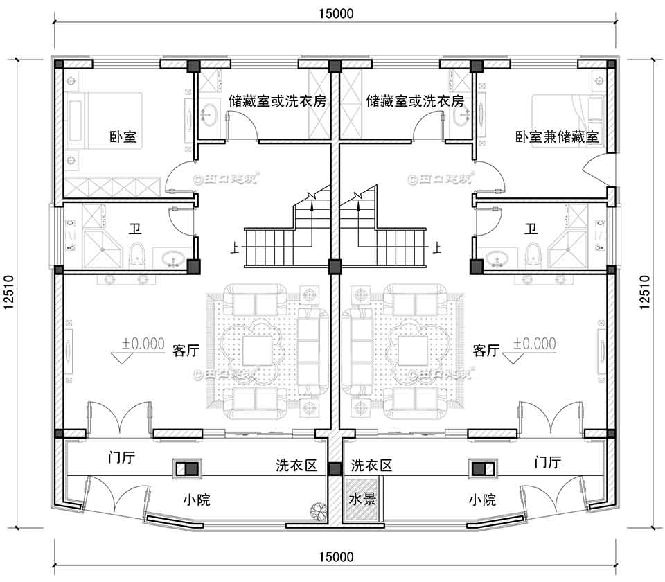 每户均设计了门厅、客厅、卫、卧室、储藏室;