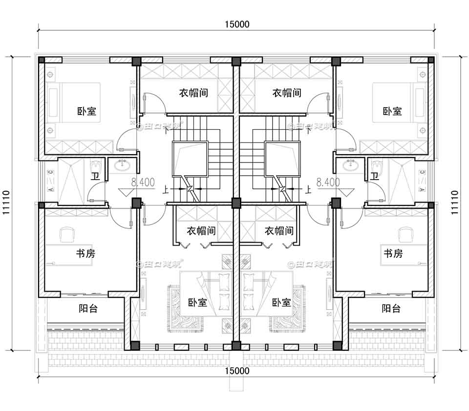 每户均设计了三个卧室(其中一个带衣帽间)、公共衣帽间、卫;